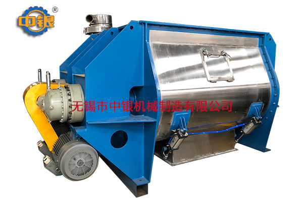 該機臥式筒體內裝有雙軸旋轉反向的漿葉,漿葉成一定角度將物料沿軸向、徑向循環翻攪,使物料迅速混合均勻;為降低設備易損件的更換成本,槳葉葉片可做成兩片式,在葉片基座上墊一塊可移動小葉片,可直接更換磨損的小葉片,經濟快捷; 出料形式一般為氣動(手動)翻板閥,圓弧閥門緊密嵌入筒內,與筒內壁齊平,無物料堆積和混合死角現象;標準型有大開門小開門之分,大開門開口到筒邊,放料干凈快捷,殘留少。